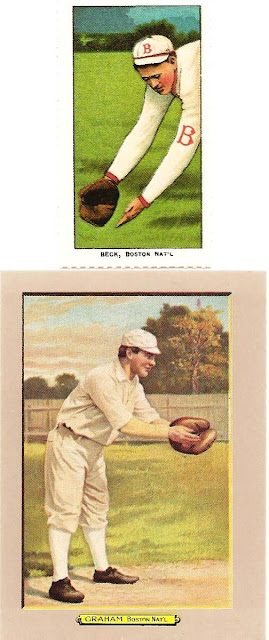 Obviously the bottom card is a reprint from an early Turkey Red set, probably produced in or around 1910. What it doesn't tell us is who reprinted it (I am guessing Dover Publishing) and when the reprinted it. I find that information helpful when cataloging my cards. I still have no info on it. The same can be said of the "T206" reprint above it. It appears to be a Dover reprint of the Renata Galasso reprint set. It is perforated which makes sense as Dover. The back clearly shows the Galasso reprint. Their set released in 1983 as a complete set known as "The Monster" which I have. Other thaqn those tidbits, I know nothing.